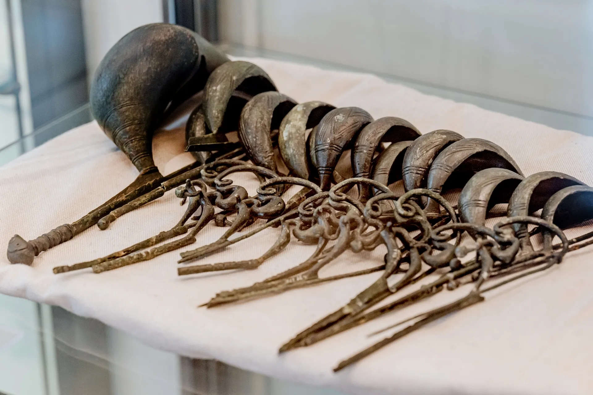 Di eccezionale ricchezza è la tomba 2 dal Circolo delle Fibule, con un corredo che vanta oltre 400 fibule in bronzo e ferro, e un monumentale esemplare con un grande elemento in ambra. Insieme al vasellame metallico e ceramico, questo contesto e le altre otto tombe del Circolo, testimoniano l’esistenza di un’élite potente e connessa con le popolazioni etrusco-italiche, con l’Egeo e le culture del Nord, tra la fine del VII e l’inizio del V sec. a.C.