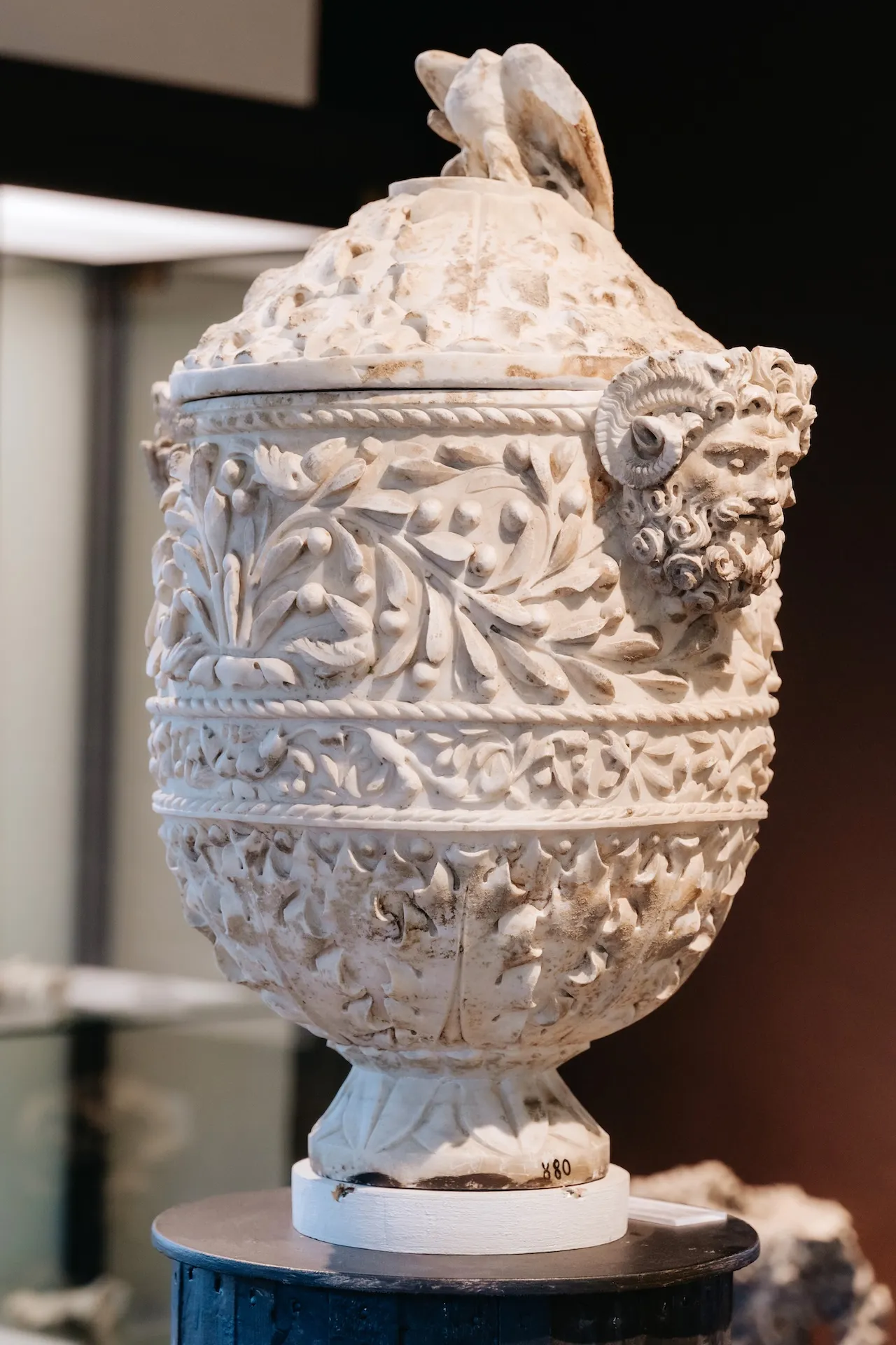 In esposizione troviamo poche testimonianze, tutte legate alla sfera funeraria: sono principalmente epigrafi, stele e un’urna cineraria sporadica ma di straordinaria fattura, sicuramente di officina urbana, appartenente con ogni probabilità a un personaggio eminente del municipio, attribuibile all’inizio del II sec. d.C.